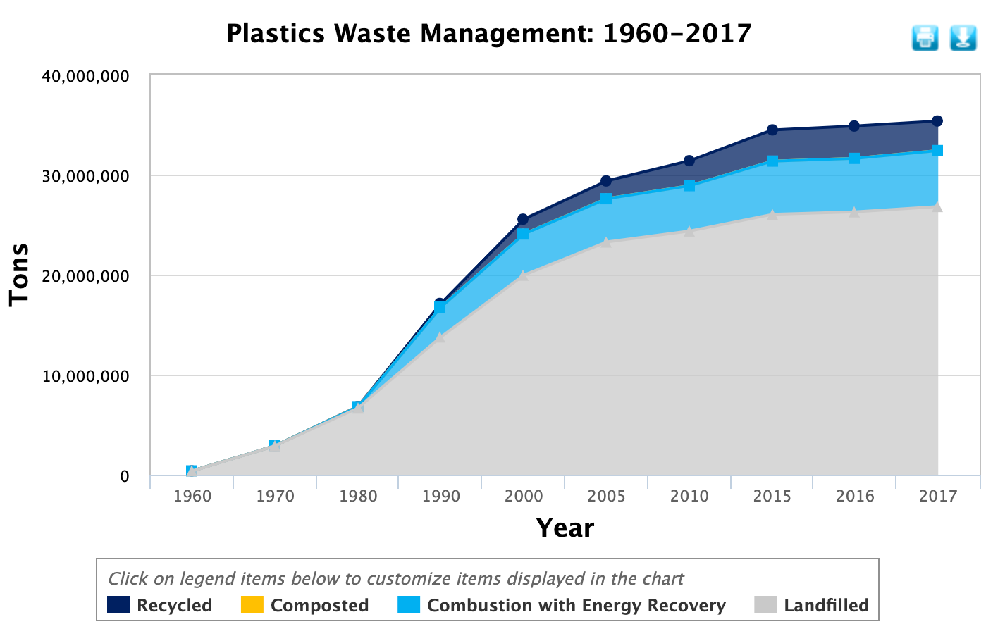 As of 2017, the United States is generating ~35 million tons of plastic per year, of which only 8% is recycled. This data is from before the China ban, making me think that the percentage is probably even lower now, especially as total exports have fallen dramatically. The implication is that the vast majority of plastic waste ends up in a landfill, where it will slowly decompose, releasing greenhouse gases into the atmosphere and microplastics into the local environment. The following chart shows the evolution of plastics waste management in the U.S. over the past six decades.